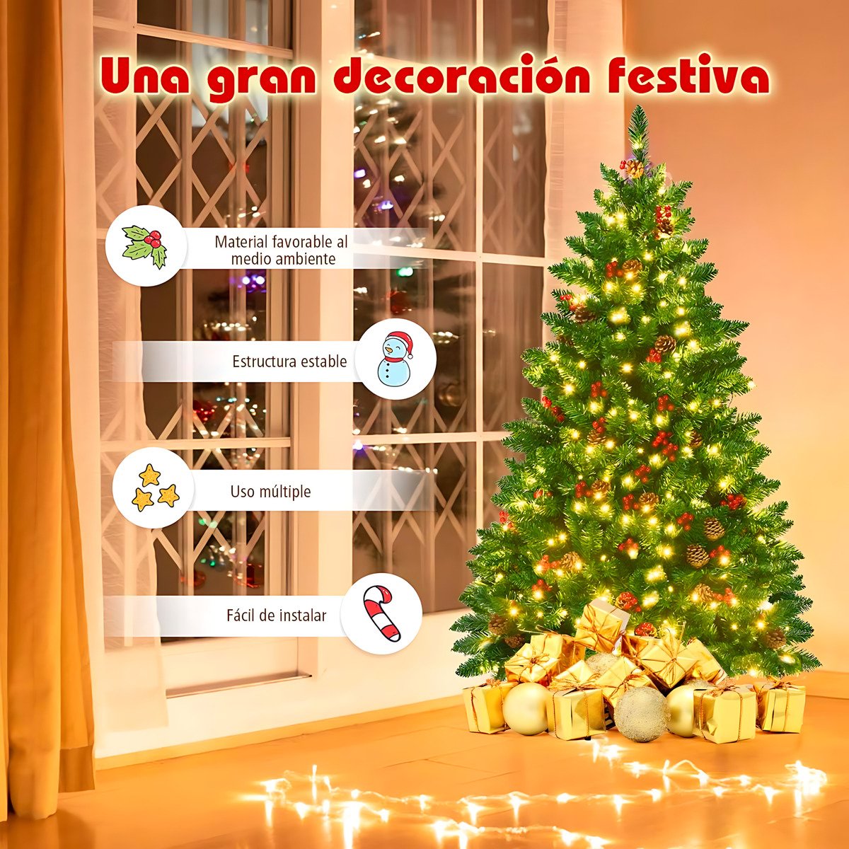 Fabricado con material de PVC de alta calidad y ecológico, este árbol artificial no solo es denso y realista, sino también seguro y duradero. Sus hojas verdes y detalladas le dan una apariencia auténtica, convirtiéndolo en el centro perfecto de tus decoraciones navideñas.
