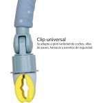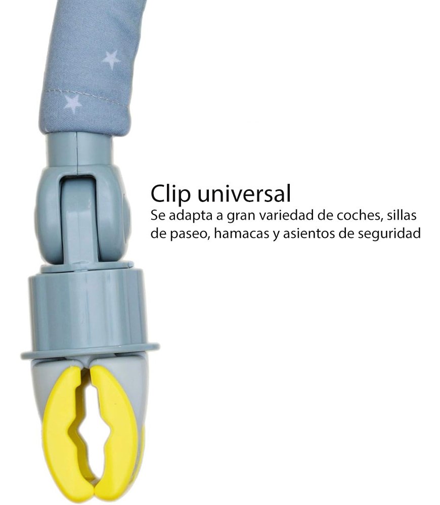 Se fija fácilmente a la mayoría de los cochecitos, asientos de coche y moisés con clips de plástico seguros, permitiendo que el bebé juegue en cualquier lugar.