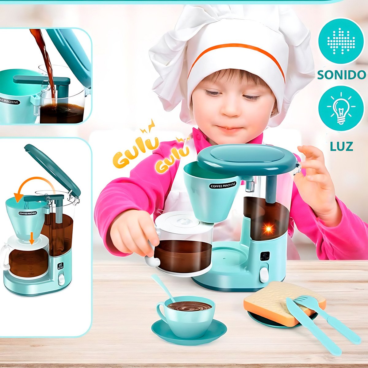 Cafetera de juguete con luz y sonido – barista infantil – juego didáctico