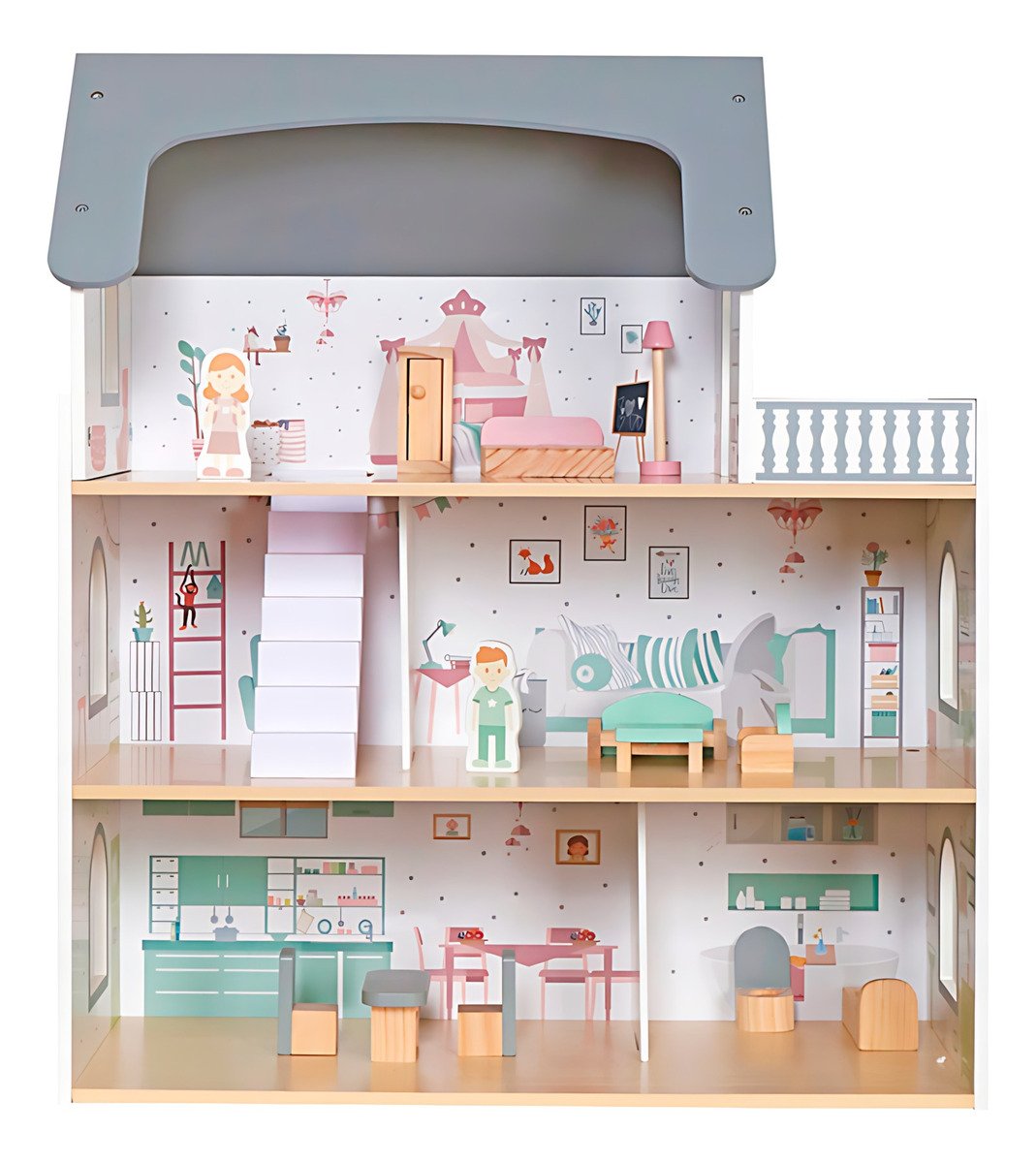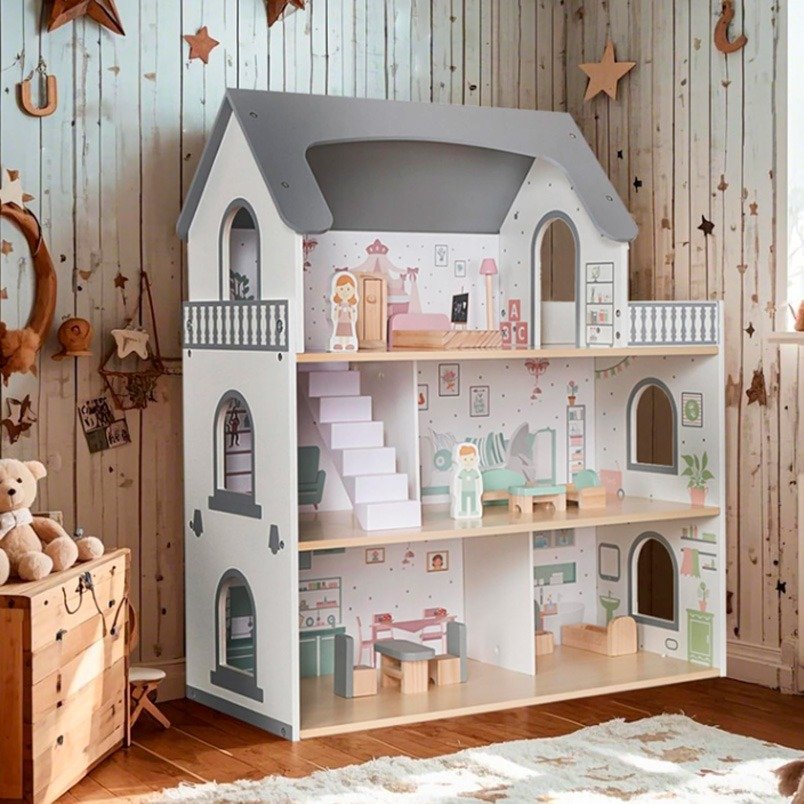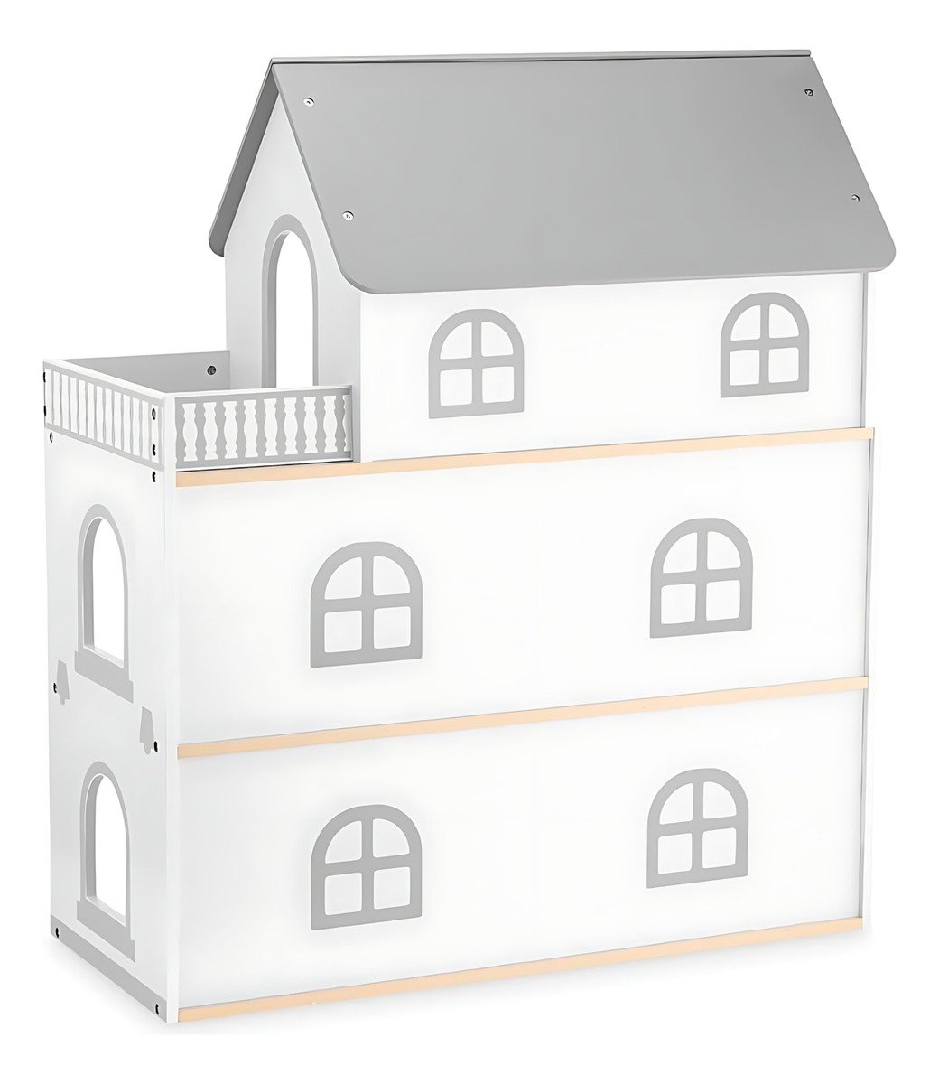 ¡El regalo perfecto para estimular la imaginación de los niños! Esta hermosa casa de muñecas de madera de 3 pisos con terraza es el escenario ideal para horas de juego y creatividad.