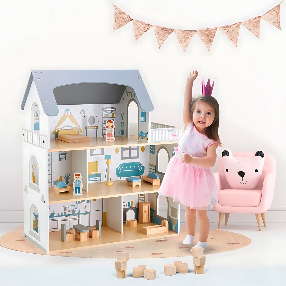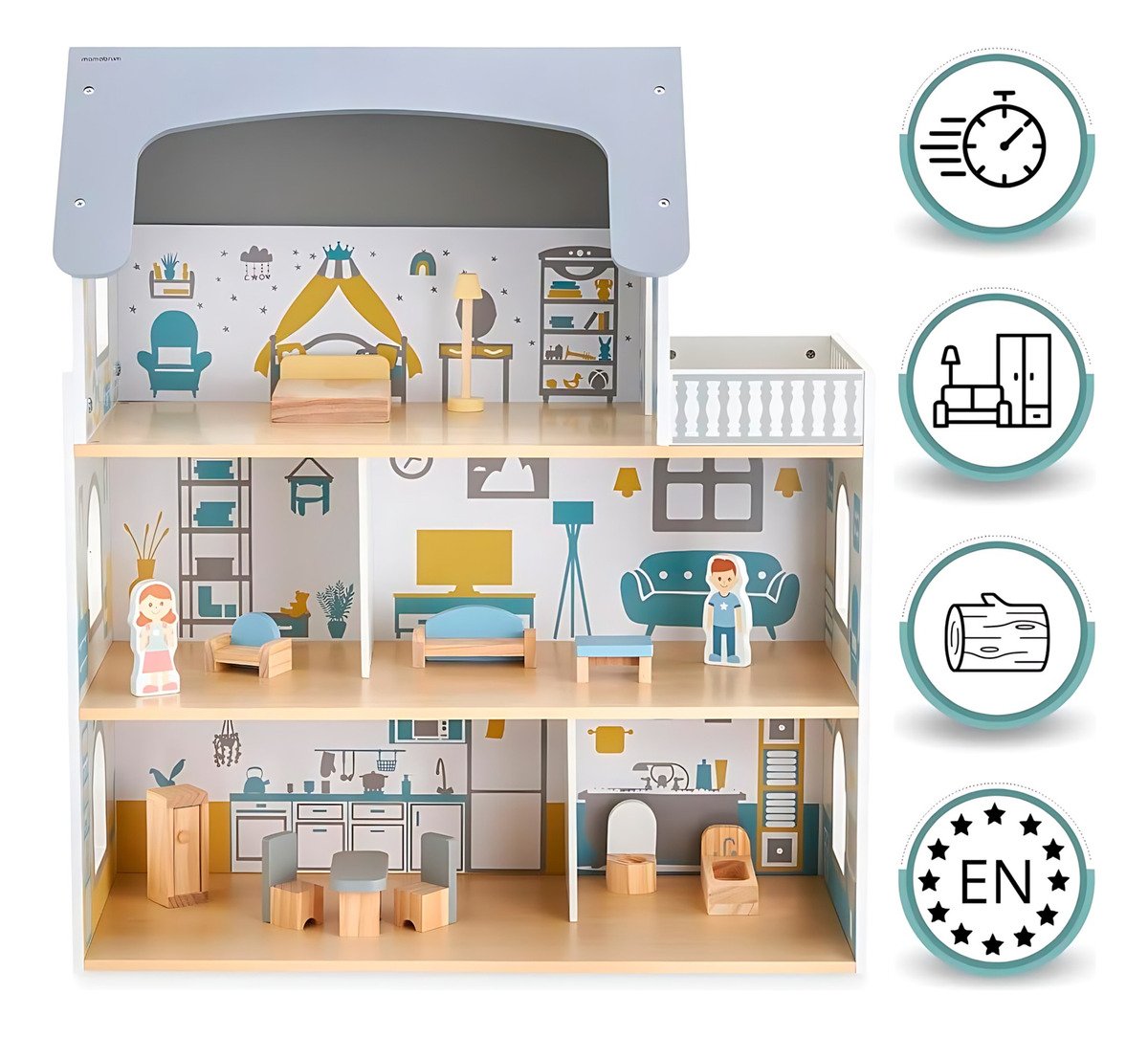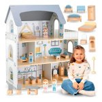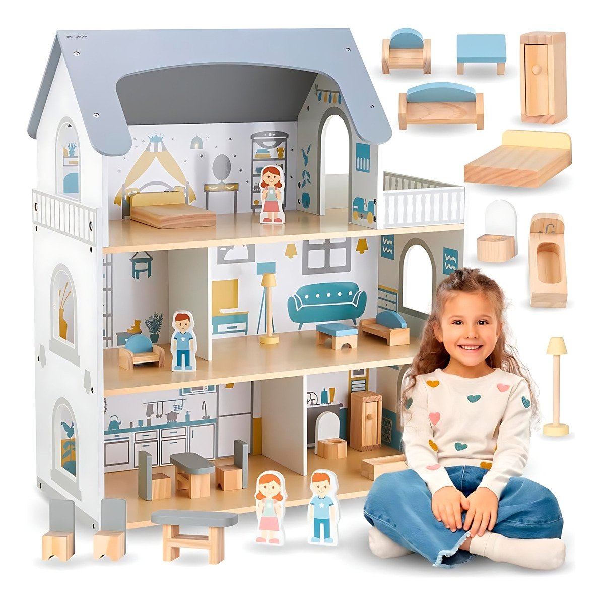 ¡El regalo perfecto para estimular la imaginación de los niños! Esta hermosa casa de muñecas de madera de 3 pisos con terraza es el escenario ideal para horas de juego y creatividad.