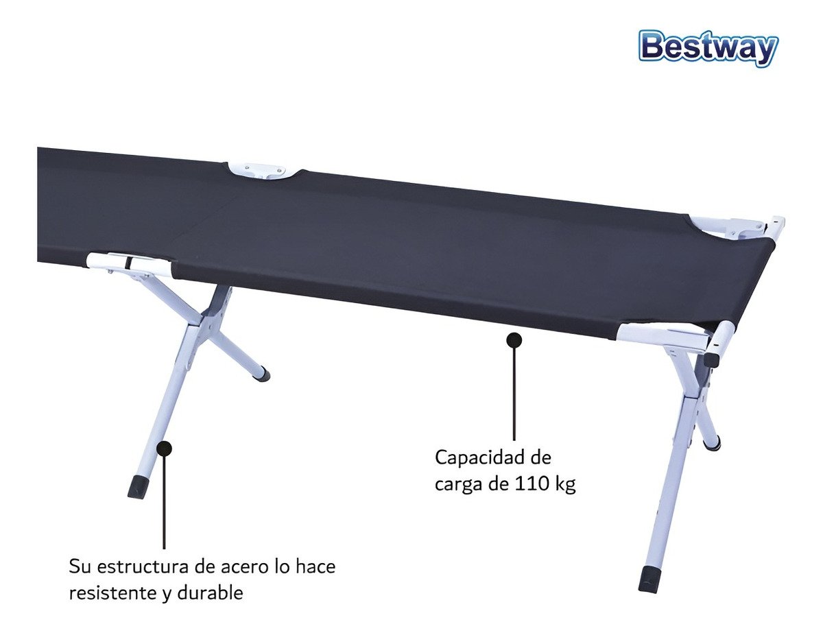 Imagina dormir cómodamente elevado del suelo, protegido por la estabilidad absoluta que brinda la estructura de acero del Catre Bestway. Su diseño plegable facilita su transporte y almacenamiento, permitiéndote llevarlo contigo a cualquier lugar con total facilidad. Prepárate para disfrutar de noches de descanso reparador bajo las estrellas, gracias a este catre diseñado pensando en tu confort y conveniencia.
