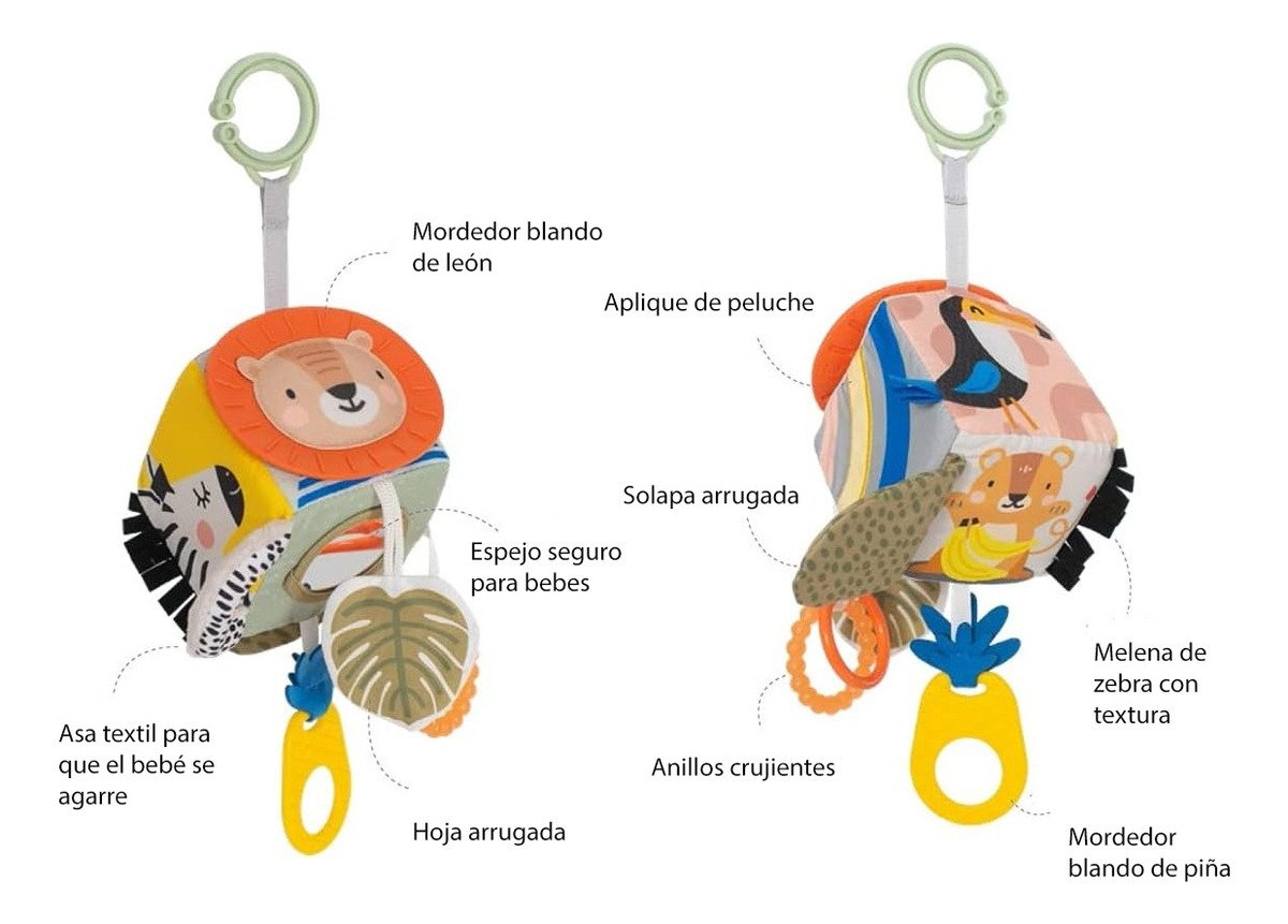 Ayuda a desarrollar la imaginación, los sentidos y las habilidades motoras a través de sus múltiples características. Incluye un suave sonajero que emite un sonido agradable al agitarlo o apretarlo, promoviendo la coordinación mano-ojo y el desarrollo auditivo.
