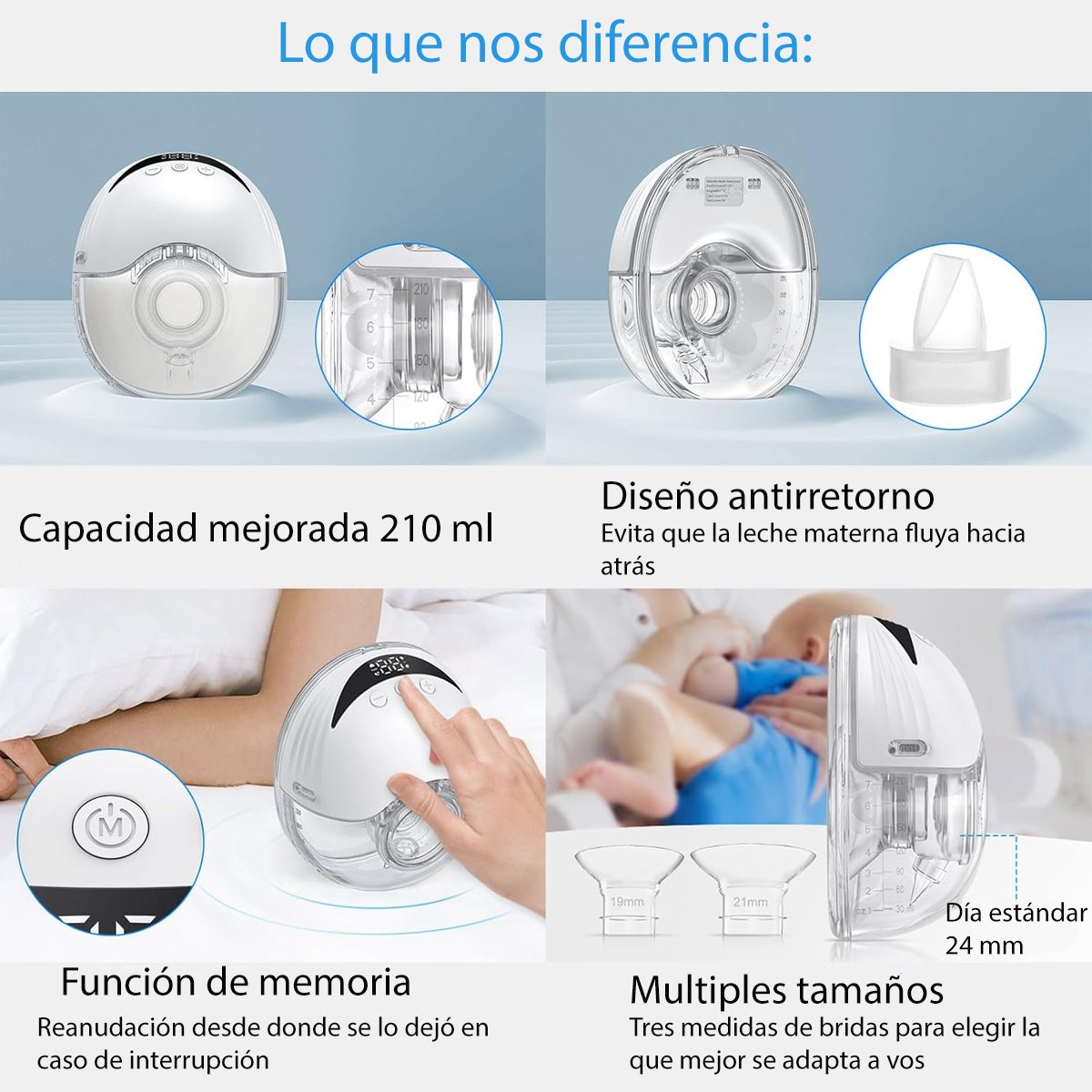 Con una capacidad de 210ml y bridas de 24/21/19 mm, es ideal para todas las mamás lactantes, incluso aquellas con necesidades más específicas. Además, su diseño antidesbordamiento garantiza que cada gota de leche materna se conserve, sin fugas ni derrames. ¡Y no te preocupes por la limpieza! Su montaje es rápido y todas las piezas son fáciles de desmontar.