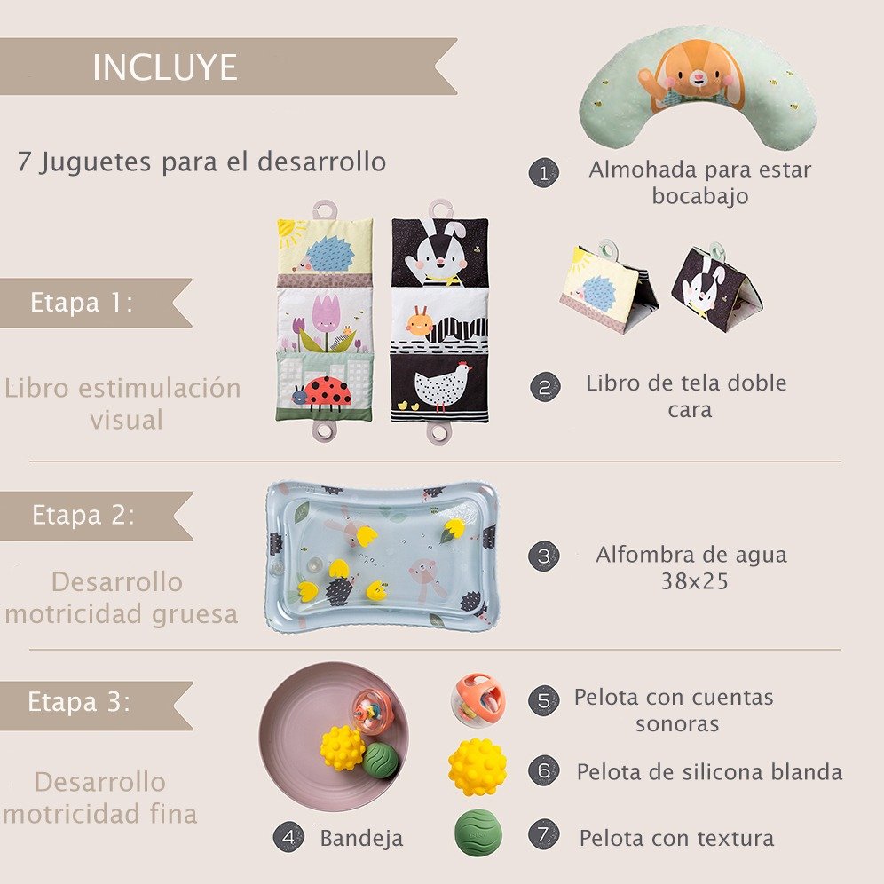 Nuestro kit incluye una almohada versátil para bebés boca abajo, que acuna suavemente a tu pequeño y ayuda a desarrollar la fuerza muscular necesaria para gatear y sentarse. La alfombra de agua vibrante con una escena submarina cautivará la atención de tu bebé, fomentando sesiones prolongadas de tiempo boca abajo. Además, el fascinante libro arrugado de doble cara puede colgarse para estimular la vista o doblarse en forma de pirámide para que se sostenga por sí solo.
