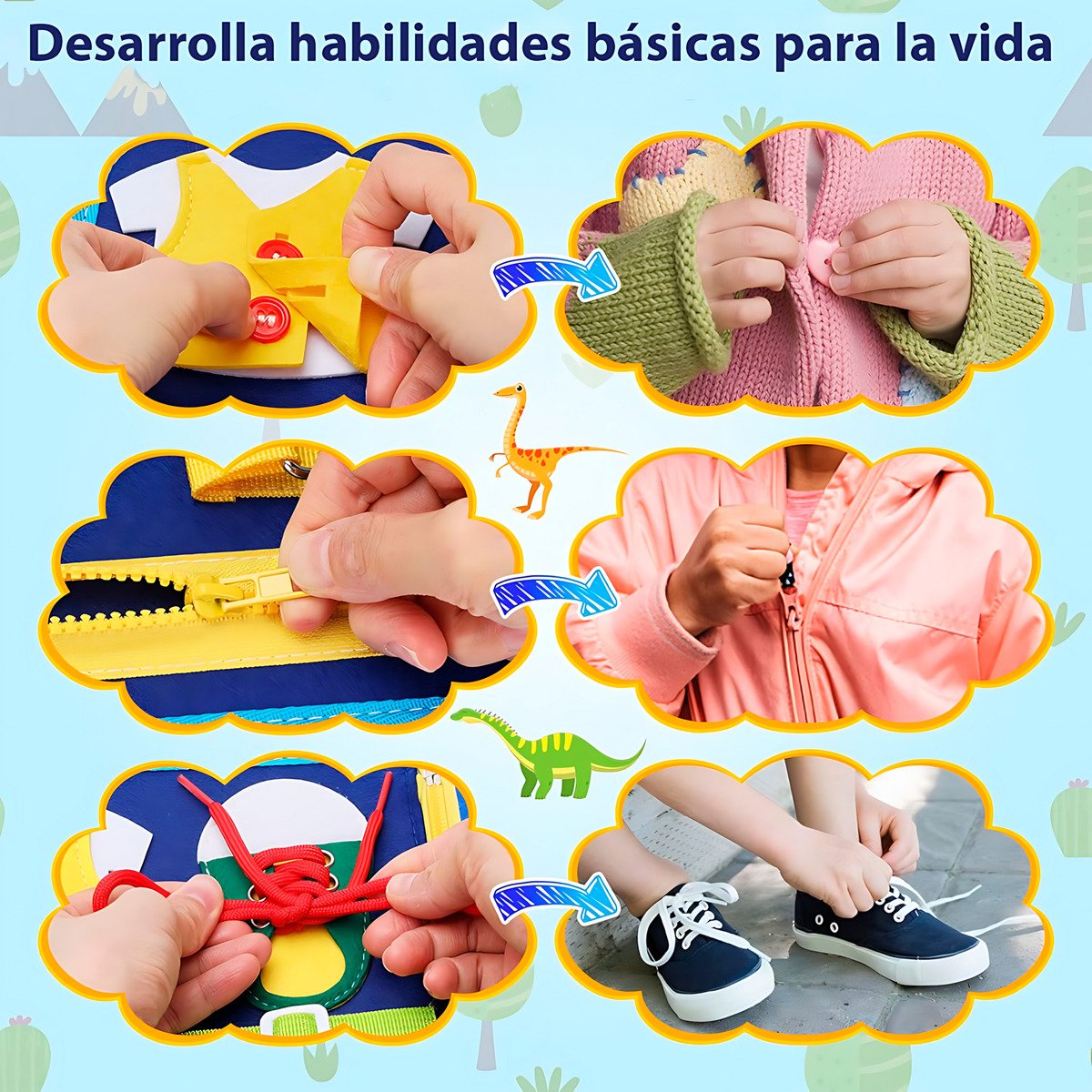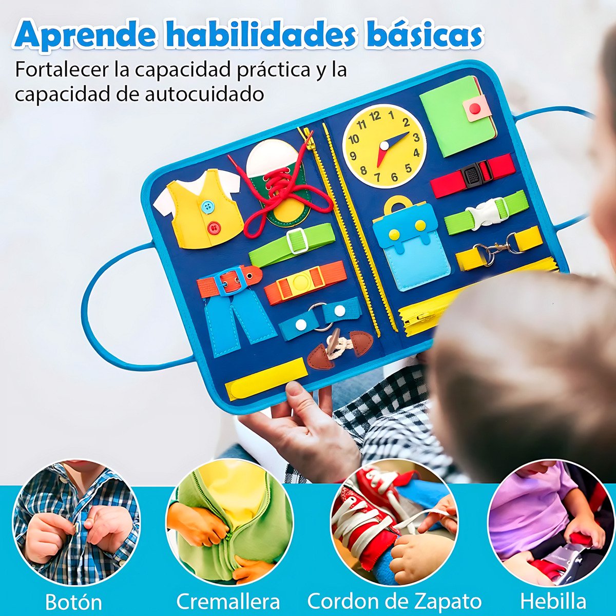 Reloj didáctico, cremalleras, botones y velcros para practicar habilidades prácticas de vestimenta