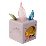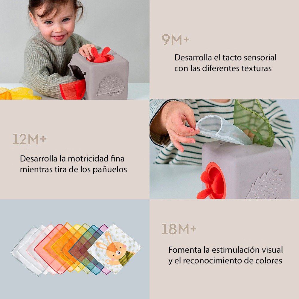 Con seis lados llenos de emoción, tu bebé encontrará una cabeza de conejito para jugar a las escondidas, un lado táctil sensorial de erizo y una flor 3D para la diversión táctil. Además, una abertura especial permite a las pequeñas manos agarrar y jugar con los pañuelos, promoviendo la exploración y el aprendizaje sensorial.