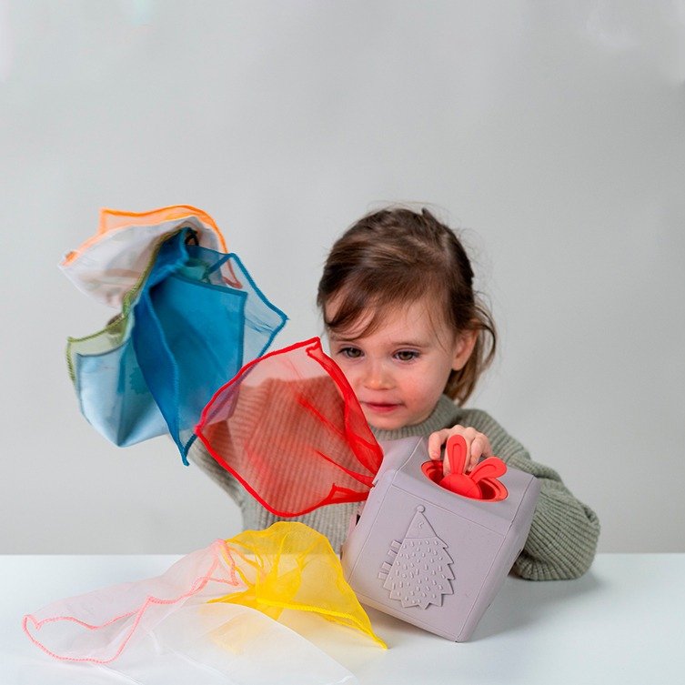 Incluye 9 pañuelos de organza y una tela ilustrada, añadiendo un toque de color y textura que encantará a tu bebé. Este juguete no solo ofrece horas de diversión, sino que también desarrolla habilidades motoras finas, el reconocimiento de colores y números, y fomenta la interacción y el juego activo.