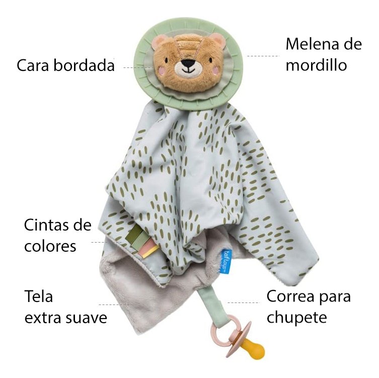 Esta manta de seguridad cuenta con un mordedor suave en la melena de león, perfecta para el alivio de las encías del bebé. Su tela extra suave y de doble capa brinda una sensación acogedora y calmante, haciéndola el compañero perfecto para que tu bebé se sienta seguro y acompañado.