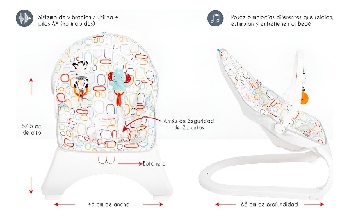 El colgante musical funciona con 2 pilas LR44 (no incluidas), mientras que el sistema vibrador requiere 1 pila D (no incluida), asegurando horas de diversión ininterrumpida para tu bebé.